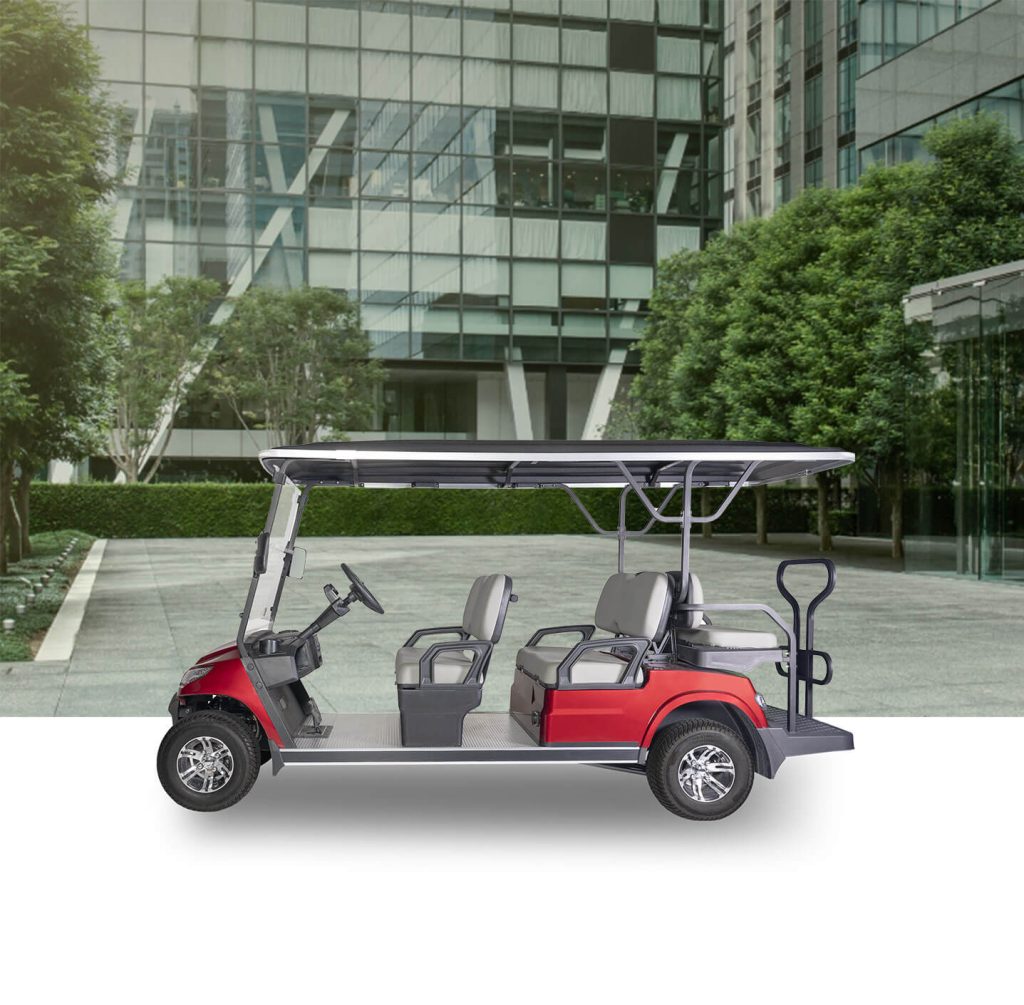 The Jett LR6 is our premium six seat cart in a non-lifted format. It features a powerful 5kW motor made by Toyota, providing ample power and reliability. To ensure a smooth ride, the cart is equipped with McPherson independent suspension with helical spring + cylinder hydraulic shock absorption. The Jett is ideal for luxury journeys for larger groups and VIP’s