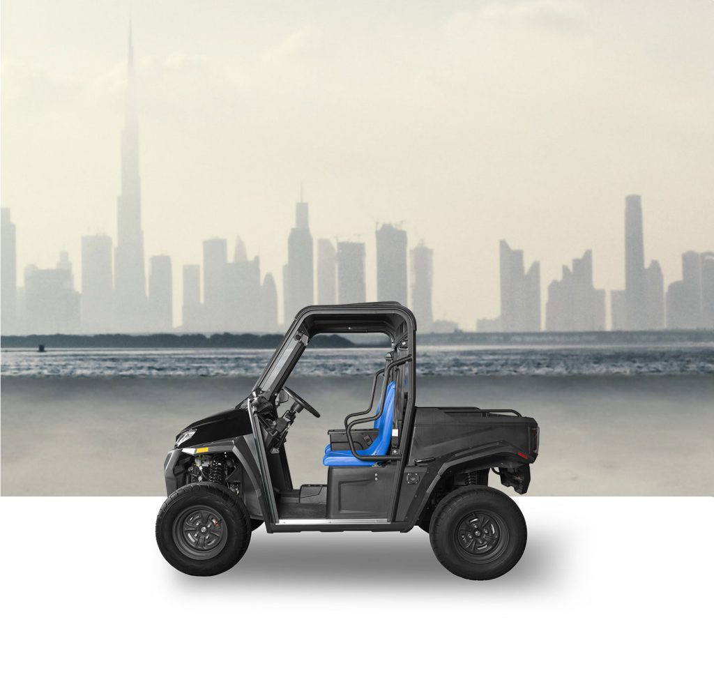 This is a workhorse lifted utility mule that TGBG adds additional anti-corrosion treatment to to make it even more robust for the GCC climate. The cart has a 48v/5kw motor to ensure it has enough power for your everyday needs and the cargo box size is:73cm x 107cm x 26.5cm. The cart comes with all round disc brakes and a range of options like off road tyres, doors, AC, winch and four wheel drive. Additional customization can be undertaken to ensure the cart meets your specific needs.