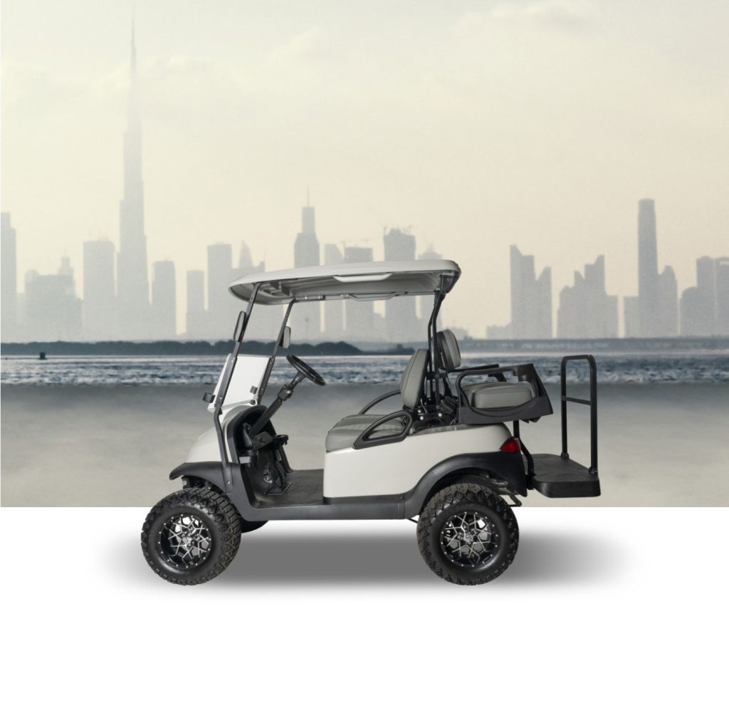 A fully refurbished lifted Club Car Precedent undergoes a bottom-up rebuild, featuring all-new suspension components, batteries, alloy wheels, windscreen, LED lights, side mirrors, re-upholstered seats, and a complete repaint. This cart can be highly customized and is sold in an ‘as new’ condition.